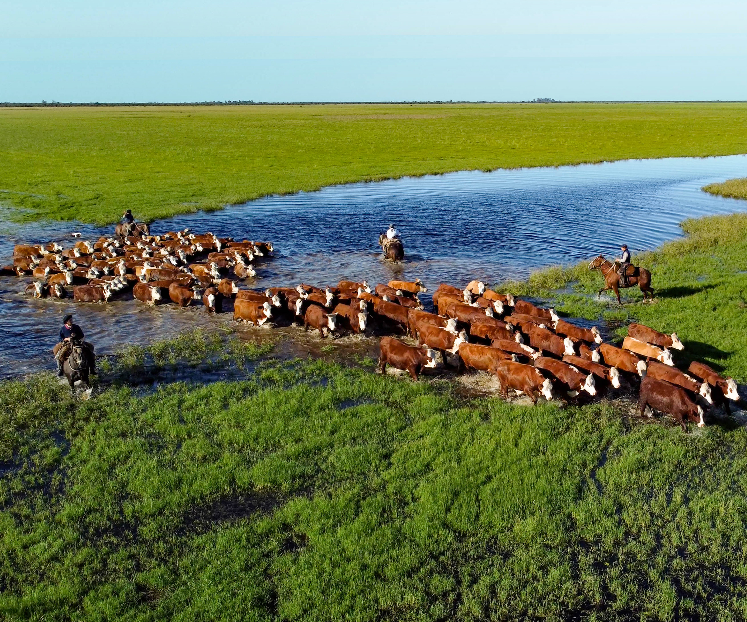 Aquí, los gauchos a caballo cuidan los rebaños en miles de hectáreas de campo. El ganado se desarrolla de forma lenta y natural, pastando libremente durante todo el año. Se alimenta de una gran variedad de pastos nativos de calidad, sin agregado de granos ni otros suplementos.