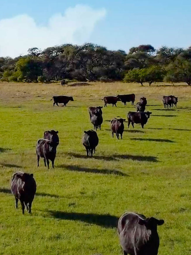 Aquí, los gauchos a caballo cuidan los rebaños en miles de hectáreas de campo. El ganado se desarrolla de forma lenta y natural, pastando libremente durante todo el año. Se alimenta de una gran variedad de pastos nativos de calidad, sin agregado de granos ni otros suplementos.